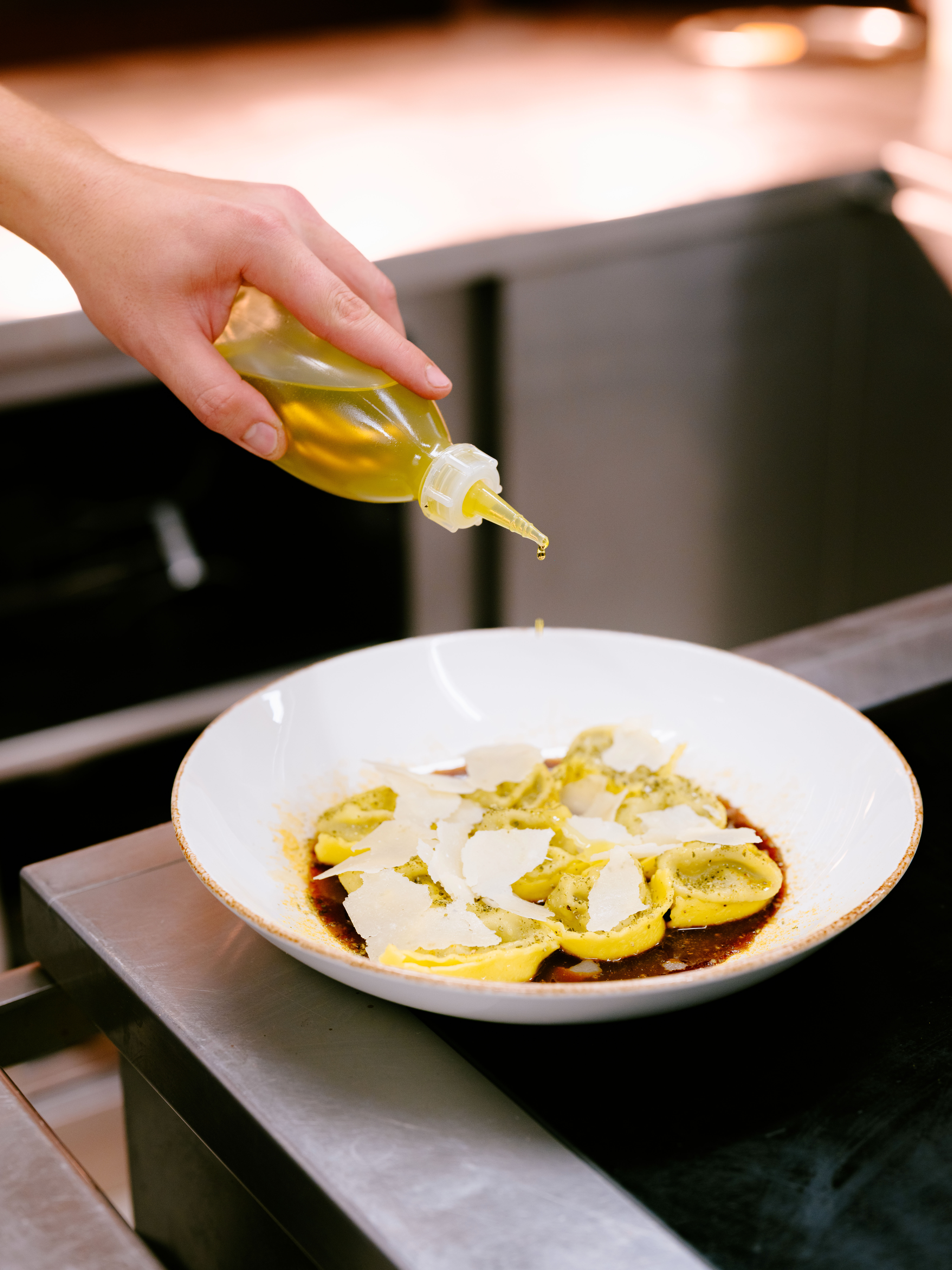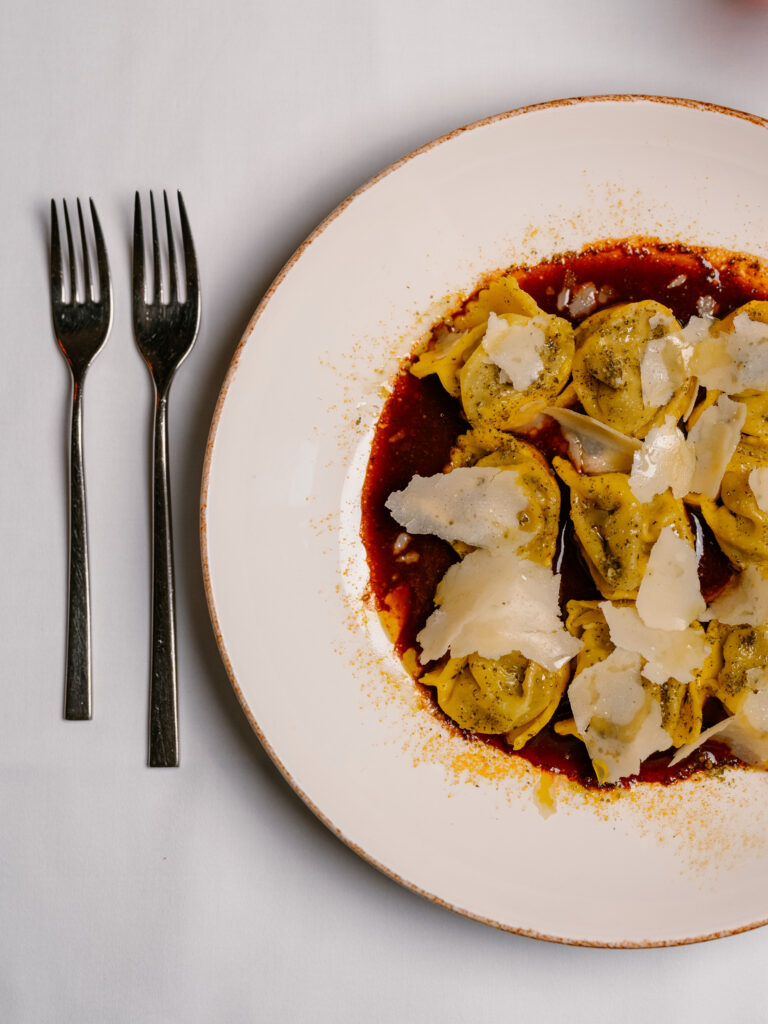 Tortelli farcis au chevreuil et au genièvre, jus de chasse à l’huile d’olive et parmesan
