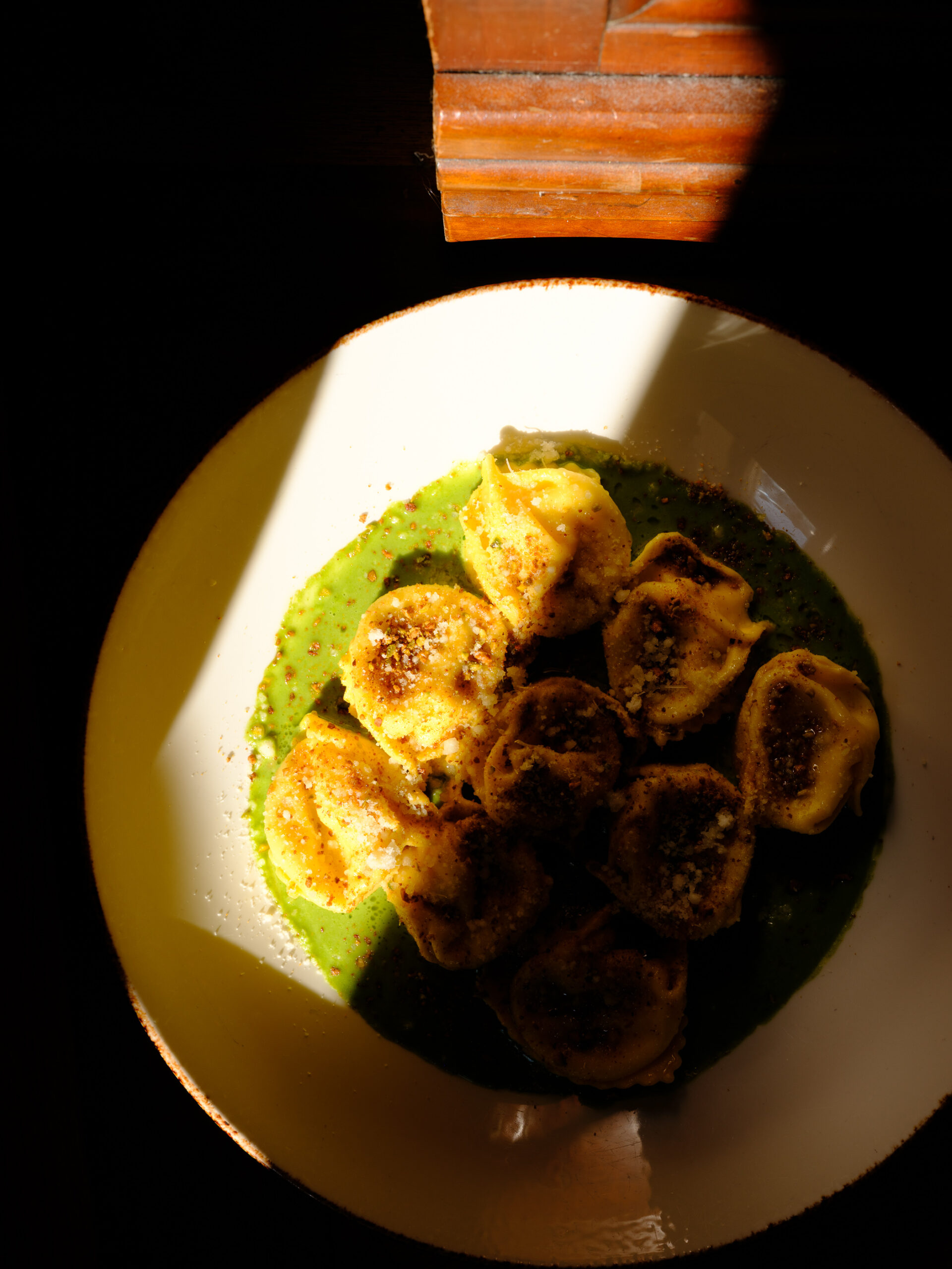 Filet de dorade poêlé à l’origan de Sicile sauce à la courge et piment d’Espelette ravioli ricotta-épinards